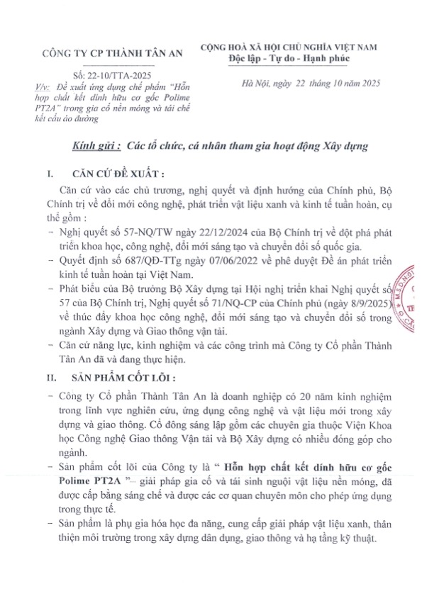 Đề xuất ứng dụng chế phẩm "Hỗn hợp chất kết dính hữu cơ gốc Polime PT2A" trong gia cố nền móng và tái chế kết cấu áo đường